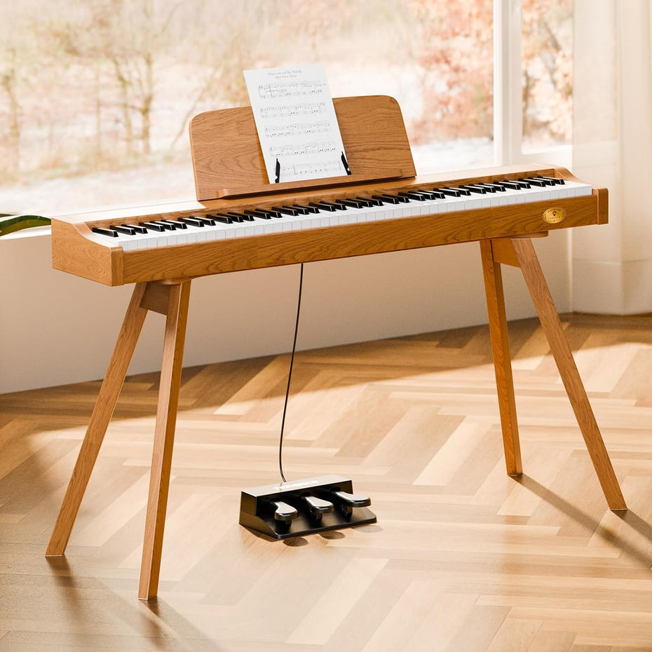 The P37 features a clean, modern look that blends effortlessly into any living space. Its streamlined design removes the bulky feel of traditional pianos, while the wood-inspired finish adds a warm, home-friendly touch. Compact and space-saving, it fits easily even in a bedroom—so you can play freely, anytime.