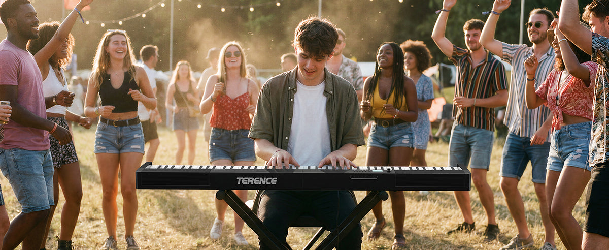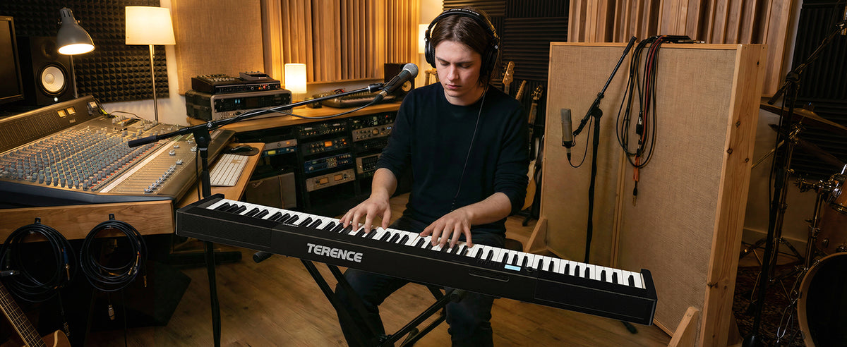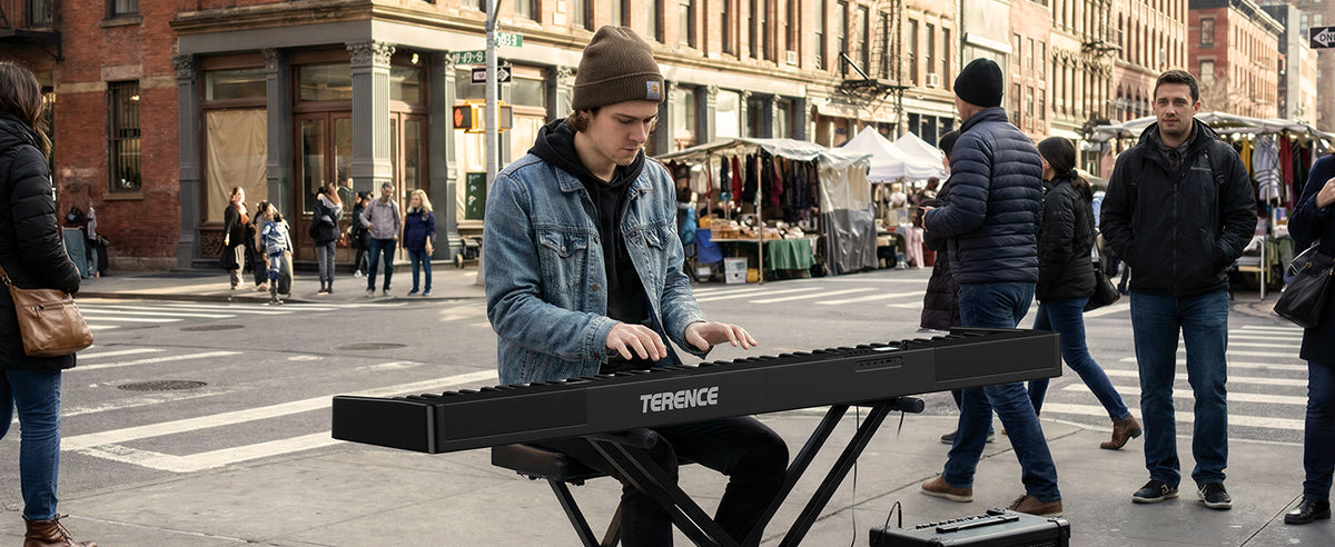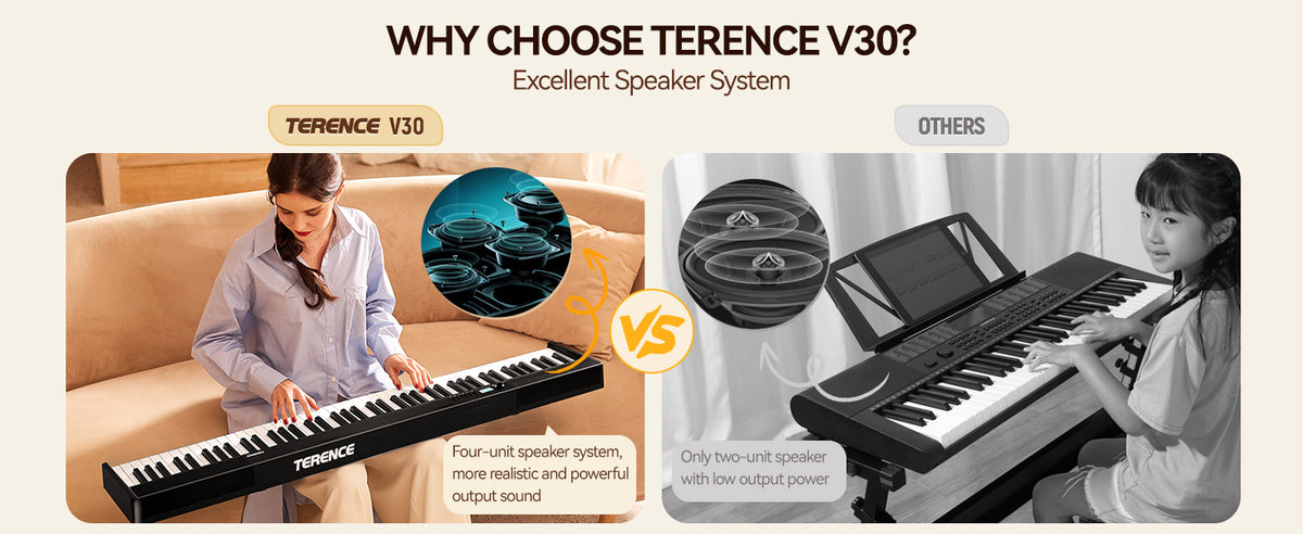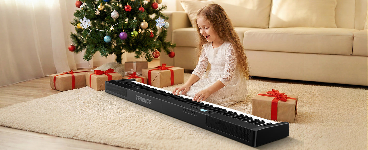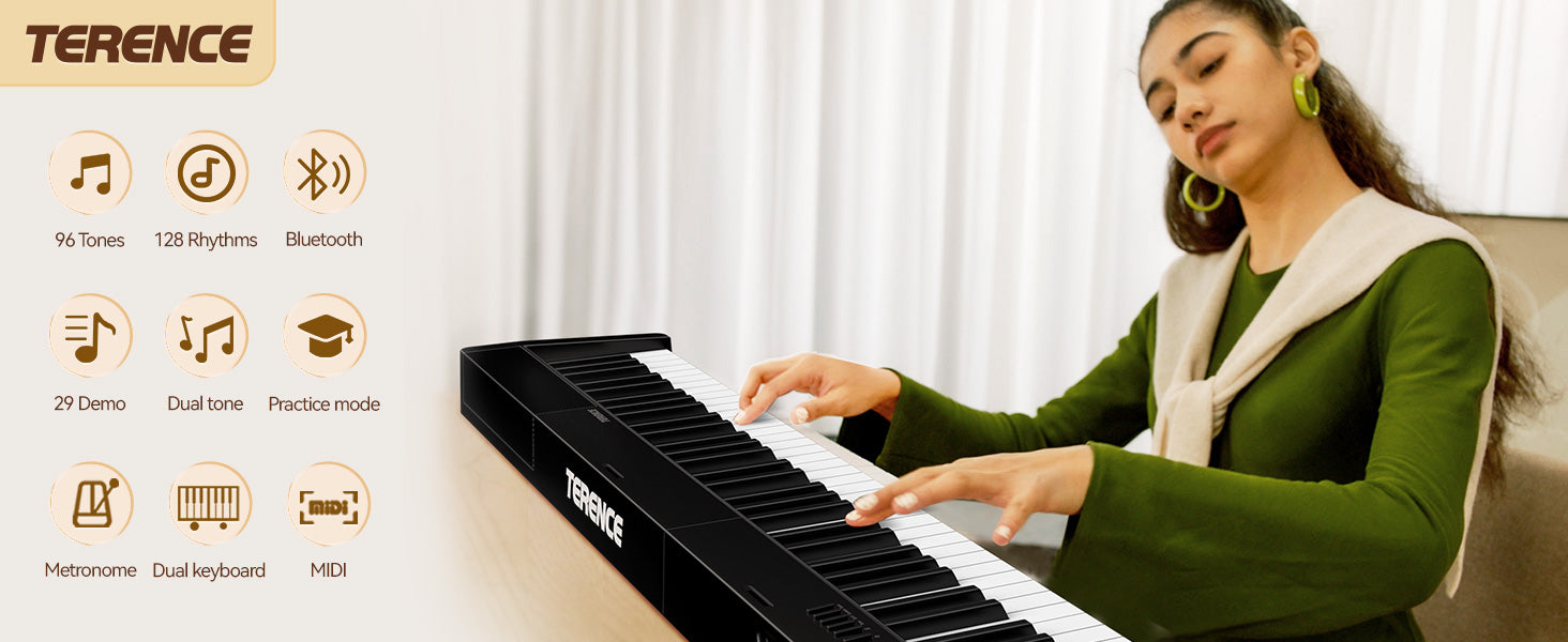 - 🔊 Upgraded Speaker System: TERENCE digital piano comes with a newly upgraded speaker system that built-in dual tone design. Meanwhile there are two 5W speakers and two 5W bass diaphragm will bring you more realistic&delicate output sound anywhere,from indoor rooms(such as home,music hall,church,studio acoustics,music learning room) to outside party.You will love it.