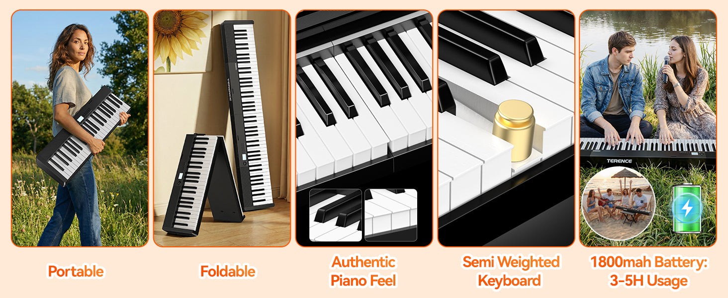 - 🎧 Multi-functional connection: TERENCE folding piano keyboard is equipped with convenient functions such as MIDI, audio input, headphone jack, microphone, pedal and power jack. Built-in Bluetooth module allows you to connect your mobile phone, computer or tablet, connect with some piano teaching applications and learn online music courses. So that you can have fun in piano learning and practice